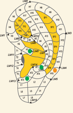 탈모에 효과적으로 작용하는 UCLA point를 살펴보면 먼저 AT1, AT3, L2 등의 상응점을 자극하고 다음으로 생리평형을유지시키는 MP0(H1), 정서문제를 조절하는 MP1(TF1), 호르몬분비를 조절하는 MP4(WT5) 등의 총괄점을 자극한다.
